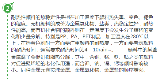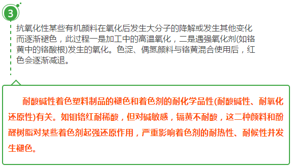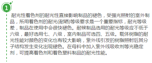 塑料著色制品受多種因素影響會(huì)發(fā)生褪色。塑料著色制品的褪色與顏料、染料的耐光性、抗氧性、耐熱性、耐酸堿性以及所用樹脂的特性有關(guān)。應(yīng)根據(jù)塑料制品的加工條件和使用要求,在生產(chǎn)母料時(shí)對(duì)所需顏料、染料、表面活性劑、分散劑、載體樹脂和防老化助劑的上述性能進(jìn)行綜合評(píng)定后才可選用。