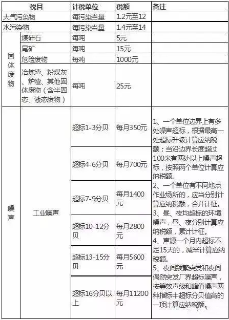 大氣污染物稅額幅度為每污染當(dāng)量1.2元-12元;水污染物稅額幅度為每污染當(dāng)量1.4元-14元;固體廢物按不同種類,稅額為每噸5元-1000元;噪聲按超標(biāo)分貝數(shù),稅額為每月350元-11200元。