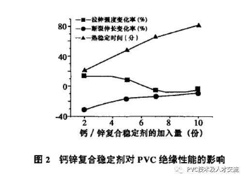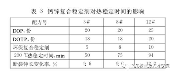 環(huán)保PVC絕緣料的穩(wěn)定劑不能含對(duì)人體有危害的鉛(Pb),鍋CCd}、汞(Hg)、砷(As)、鉻(Cr)、硒(Se)、銻(Sb)等重金屬元素,因此選用無毒的鈣鋅復(fù)合穩(wěn)定劑。鈣鋅復(fù)合穩(wěn)定劑的熱穩(wěn)定性接近或超過某些鋇/鍋穩(wěn)定劑、鉛類穩(wěn)定劑,并且耐候性好、透明性良好。鈣鋅復(fù)合穩(wěn)定劑對(duì)熱穩(wěn)定時(shí)間的影響見表3配方中填充劑25份,潤滑劑0.6份,抗氧劑0.6。鈣鋅復(fù)合穩(wěn)定劑的加入量太少材料老化性能不合格,加入量太多成本太高,一般加入5份左右比較合適。