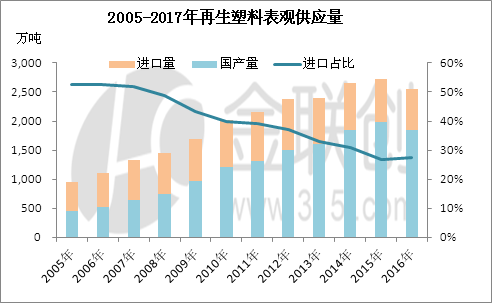 再生塑料進口基數(shù)較大,后期禁止進口后整體供應(yīng)量損失嚴(yán)重。盡管在2013年海關(guān)綠籬行動后,進口政策收緊,后期進口量增速放緩,但在整體表觀供應(yīng)量中,進口料的占比仍高達30%左右。數(shù)據(jù)顯示, 2016年再生塑料的表觀供應(yīng)量在2546.17萬噸,進口量就高達696.17萬噸,占比在27.34%。