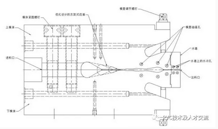 為了克服上述缺點,不少公司在模頭流道優(yōu)化設計的基礎上,對模具結構進行了改進,設計了無阻流棒結構模具,并且模唇拼接式改進為模唇、模體一體式設計,甚至增設冷水模。如下圖