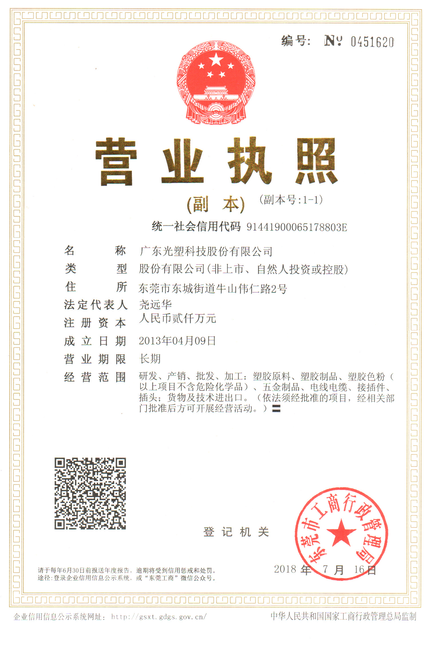 原廣東光塑塑膠有限公司從即日起更名為【廣東光塑科技股份有限公司】原公司的商務(wù)往來,商標(biāo)技術(shù)專利及其他相關(guān)業(yè)務(wù)事宜由新公司承接。光塑科技以更好、更高、更專業(yè)、更實惠的服務(wù)廣大客戶和供應(yīng)商,為股東創(chuàng)造更豐厚的價值和財富。