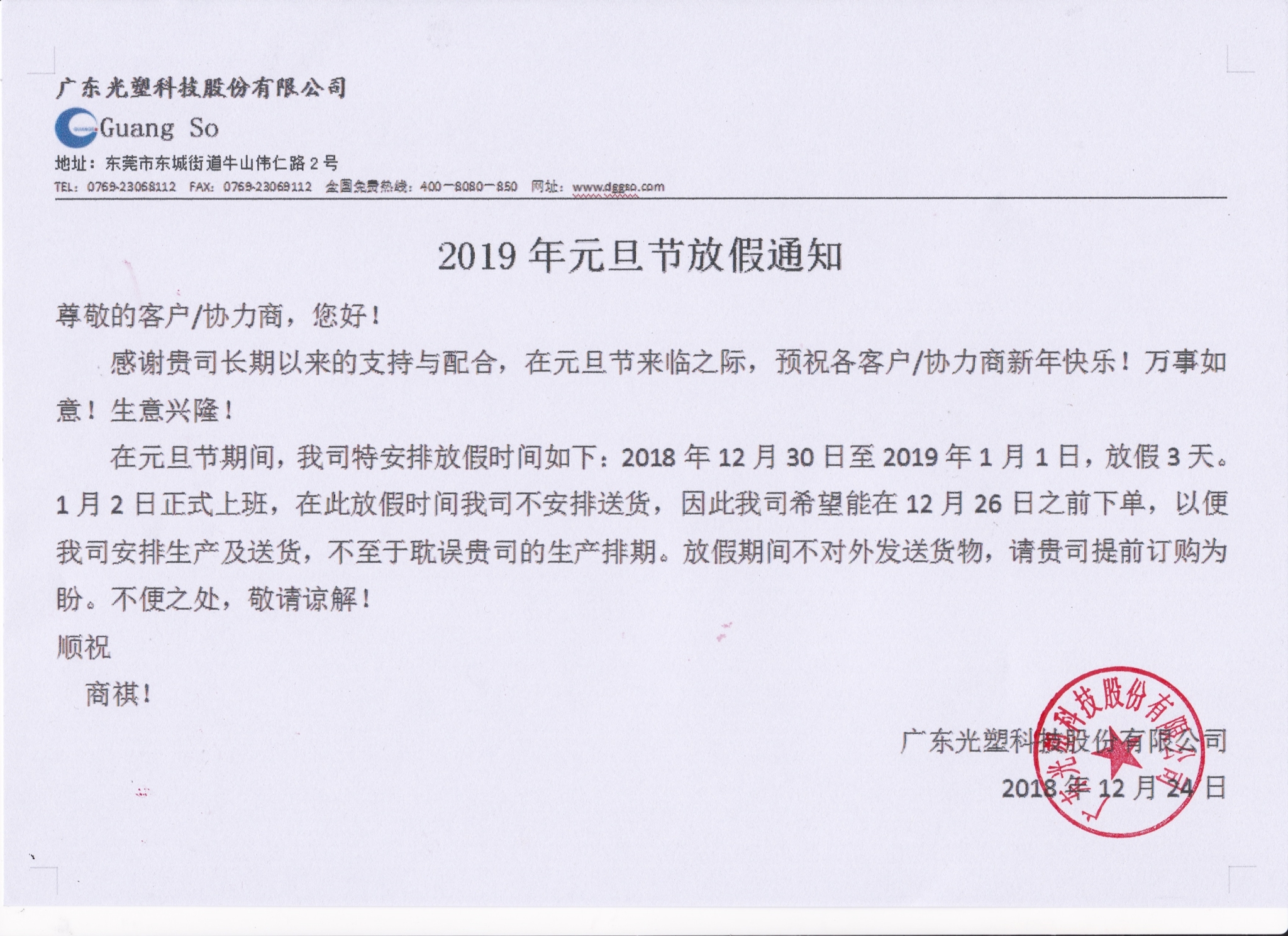 感謝貴司長期以來的支持與配合,在元旦節(jié)來臨之際,預祝各客戶/協(xié)力商新年快樂!萬事如意!生意興隆!在元旦節(jié)期間,我司特安排放假時間如下:2018年12月30日至2019年1月1日,放假3天。1月2日正式上班,在此放假時間我司不安排送貨,因此我司希望能在12月26日之前下單,以便我司安排生產(chǎn)及送貨,不至于耽誤貴司的生產(chǎn)排期。放假期間不對外發(fā)送貨物,請貴司提前訂購為盼。不便之處,敬請諒解!