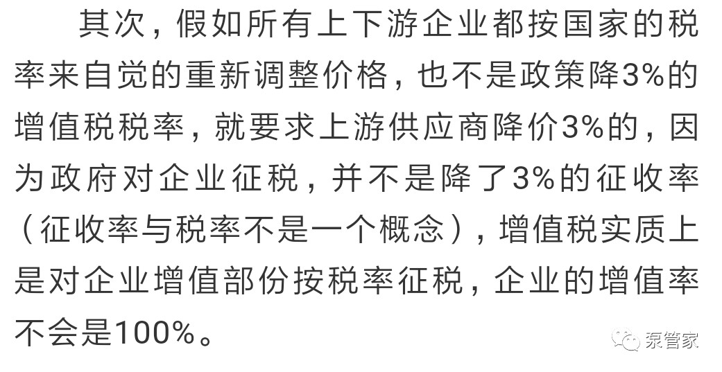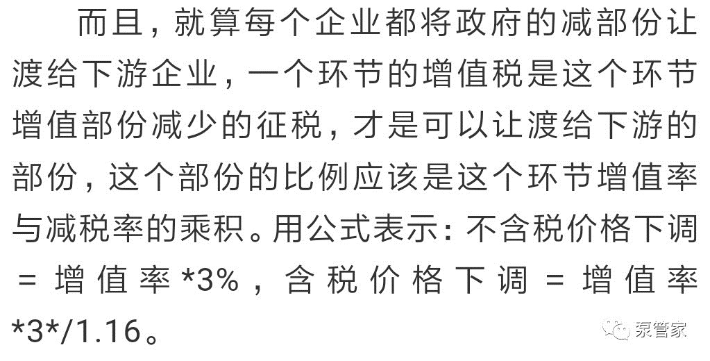 因此,從純降稅來(lái)看稅負(fù)的下降,每個(gè)企業(yè)減稅的空間,取決于該企業(yè)的增值率和上游企業(yè)的減稅轉(zhuǎn)移。實(shí)際上,上游企業(yè)也不可能是降價(jià)3%,合理的只能是將上游減稅的部份轉(zhuǎn)移到下游,正如我們分析的例子,稅率降3%,企業(yè)降價(jià)1.2%。