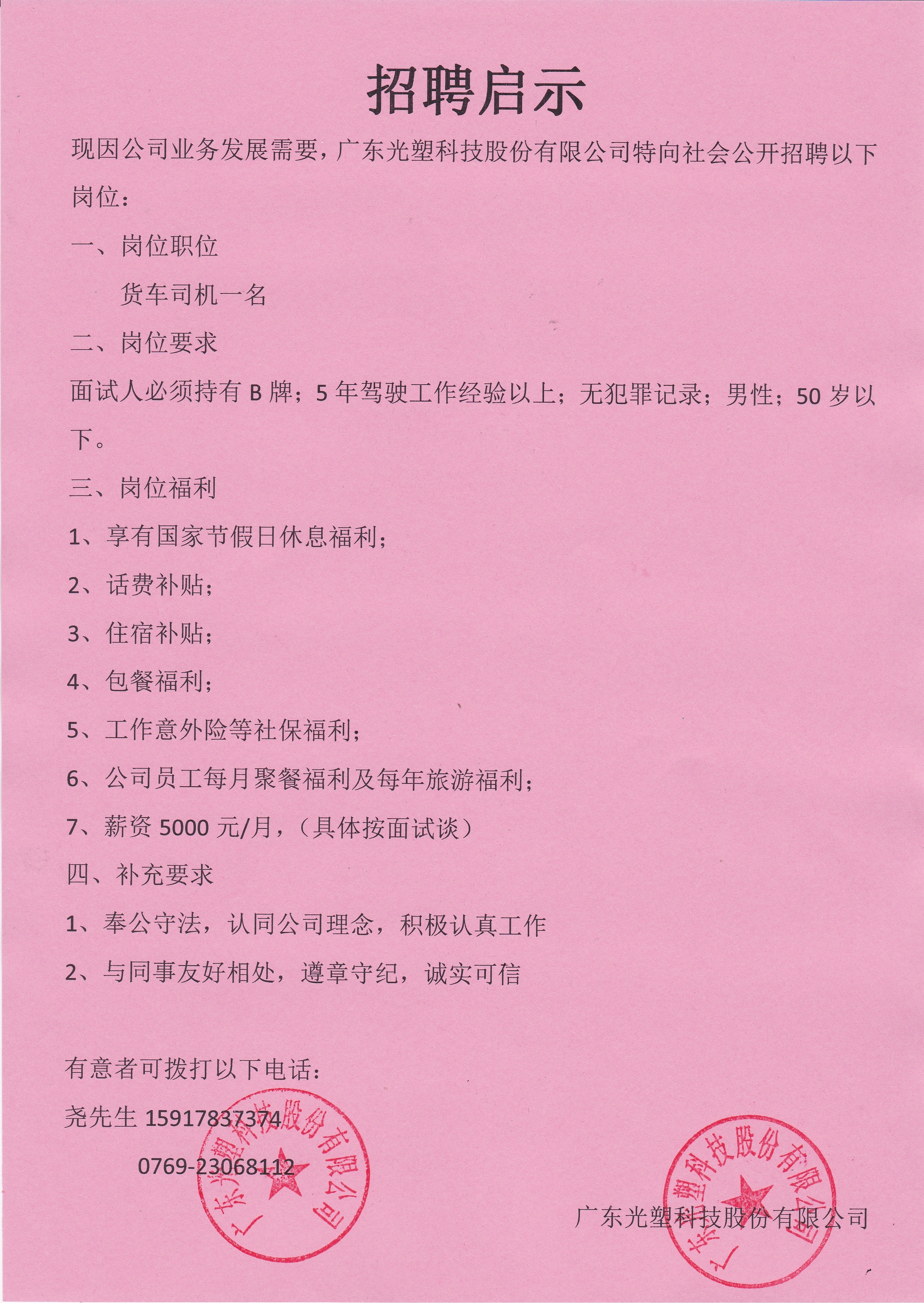 因公司需要,現(xiàn)面向社會(huì)公開招聘貨車司機(jī)一名;要求:男性,50歲以下,5年以上駕駛工作經(jīng)驗(yàn),持有B牌,無犯罪記錄。一經(jīng)錄取享有公司各種福利待遇。