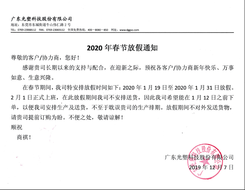 在春節(jié)期間,我司特安排放假時(shí)間如下:2020年1月19日至2020年1月31日放假。2月1日正式上班,在此放假時(shí)間我司不安排送貨,因此我司希望能在1月12日之前下單,以便我司安排生產(chǎn)及送貨,不至于耽誤貴司的生產(chǎn)排期。放假期間不對(duì)外發(fā)送貨物,請(qǐng)貴司提前訂購(gòu)為盼。不便之處,敬請(qǐng)諒解!