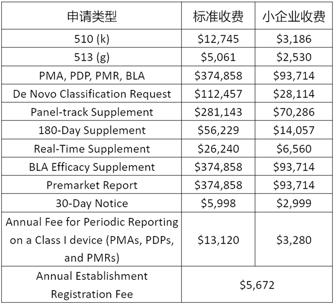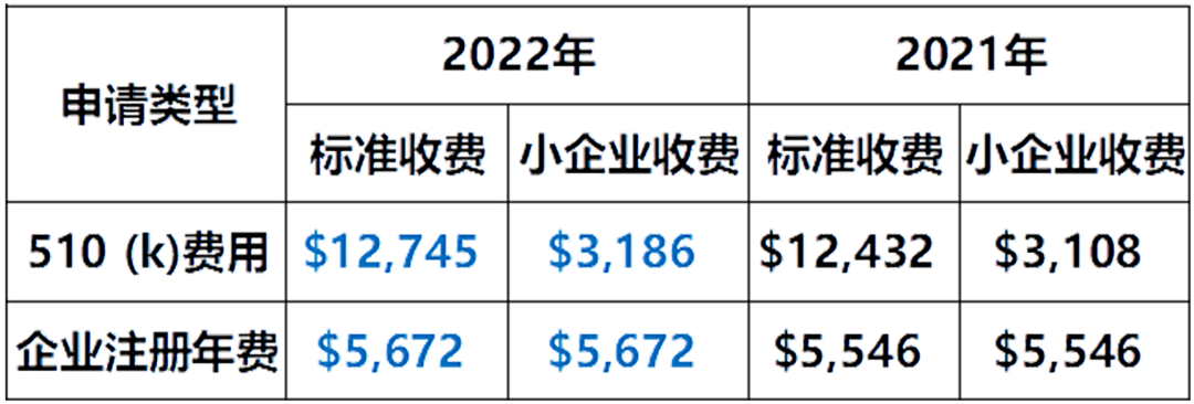 2021年8月2日,美國FDA關(guān)于2022年的收費(fèi)標(biāo)準(zhǔn)已正式公布。其中FDA企業(yè)注冊和器械列名的年費(fèi)和510(K) 申報費(fèi)用對中國的制造商影響比較大,這兩項(xiàng)費(fèi)用都略有提高。