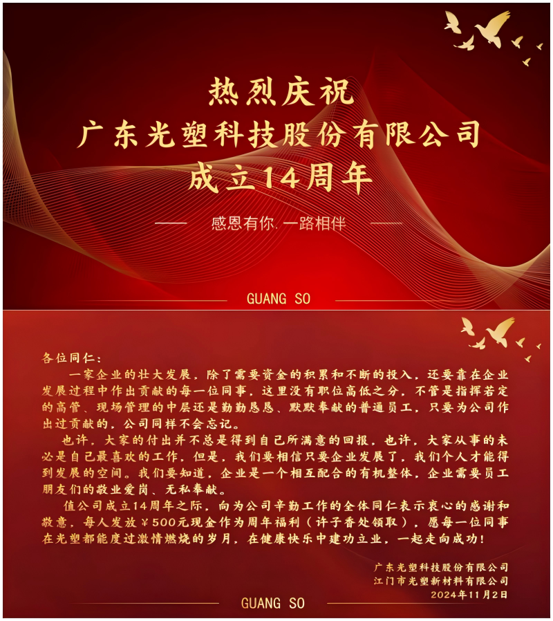 文章標(biāo)題:熱烈慶祝廣東光塑科技股份有限公司成立14周年